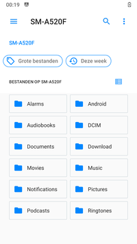 De optie "SM-A520F" is in dit geval de naam van de telefoon. Als je hier op klikt zie je alle mappen en bestanden op de telefoon opslag.